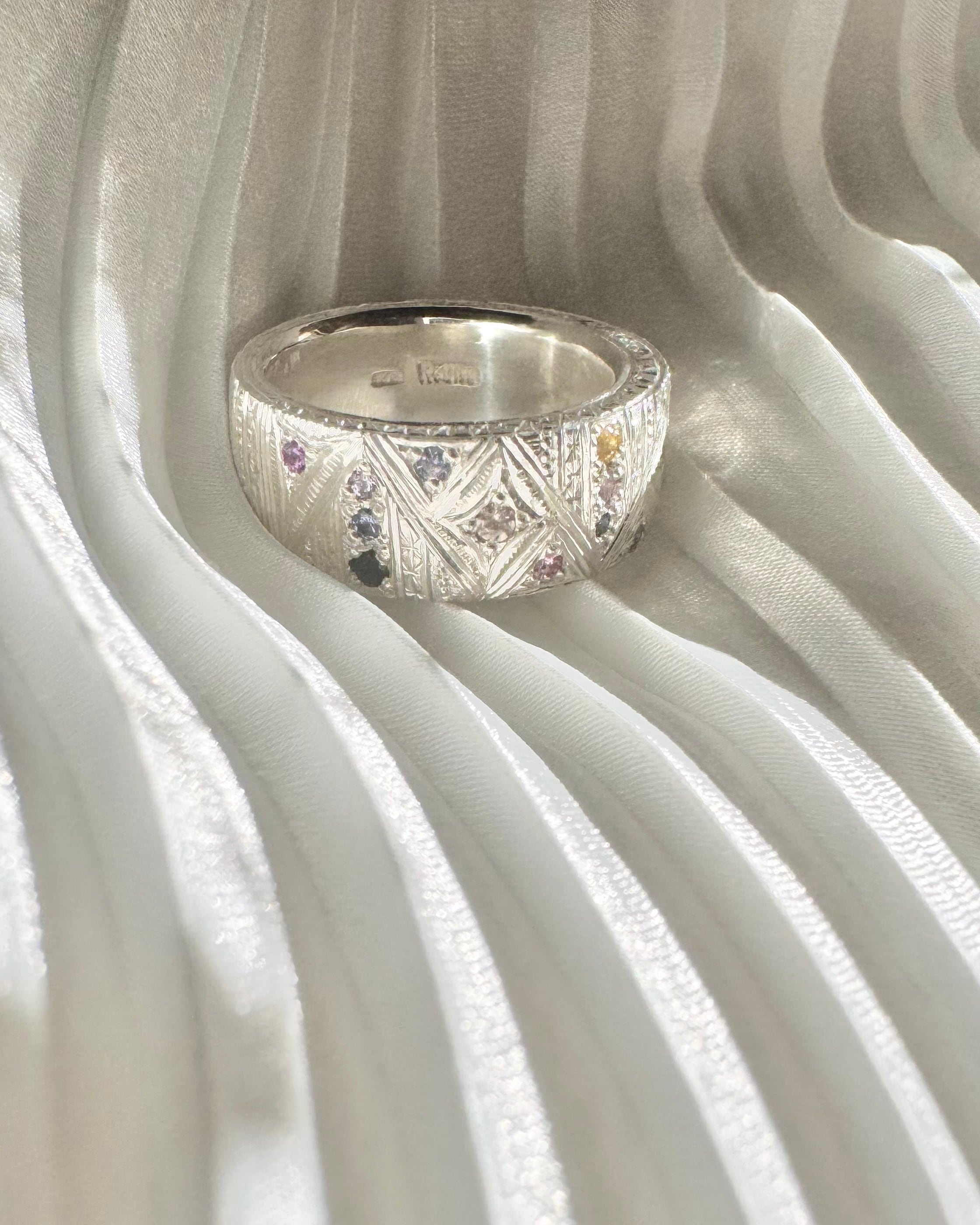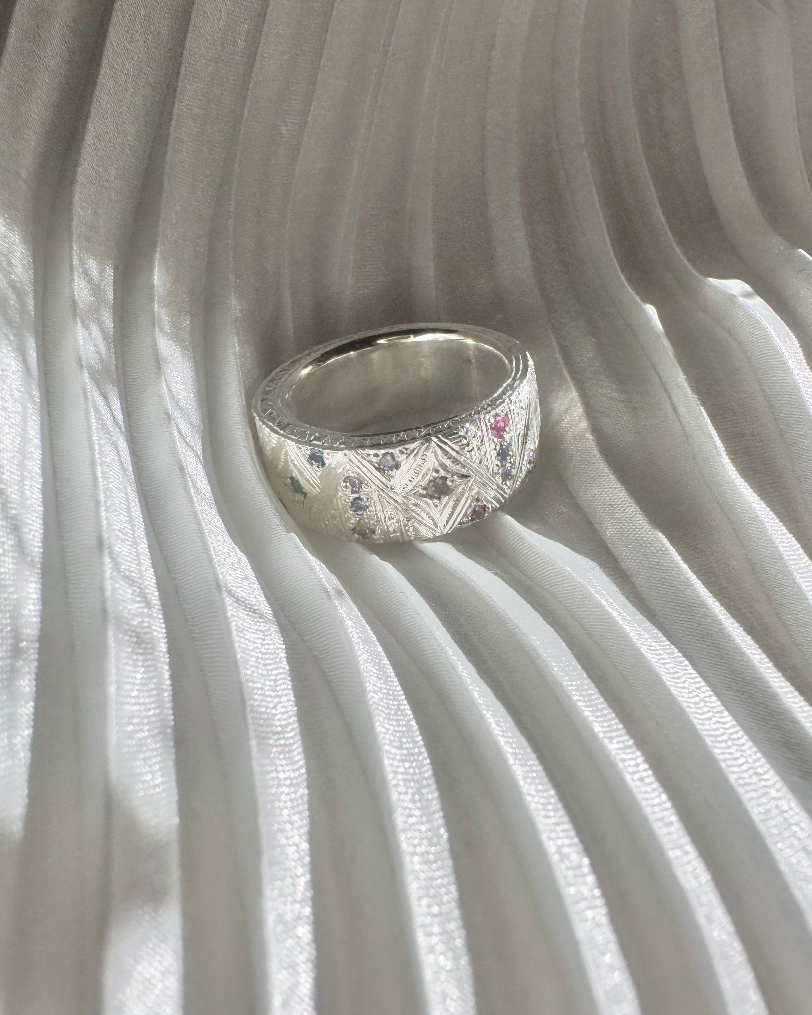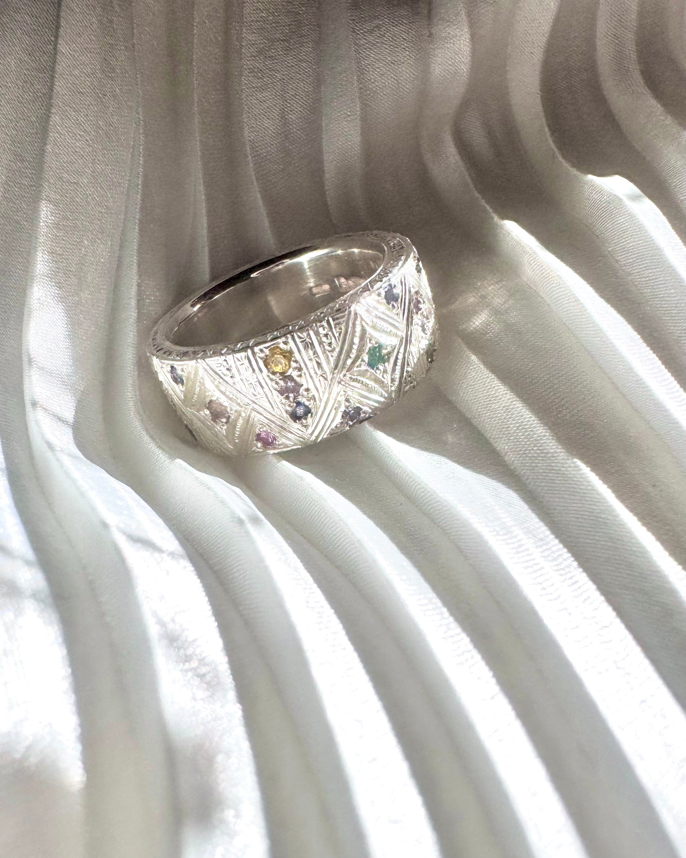 マルチカラーサファイア×ガーネット×パライバトルマリン×純銀 手彫りリング