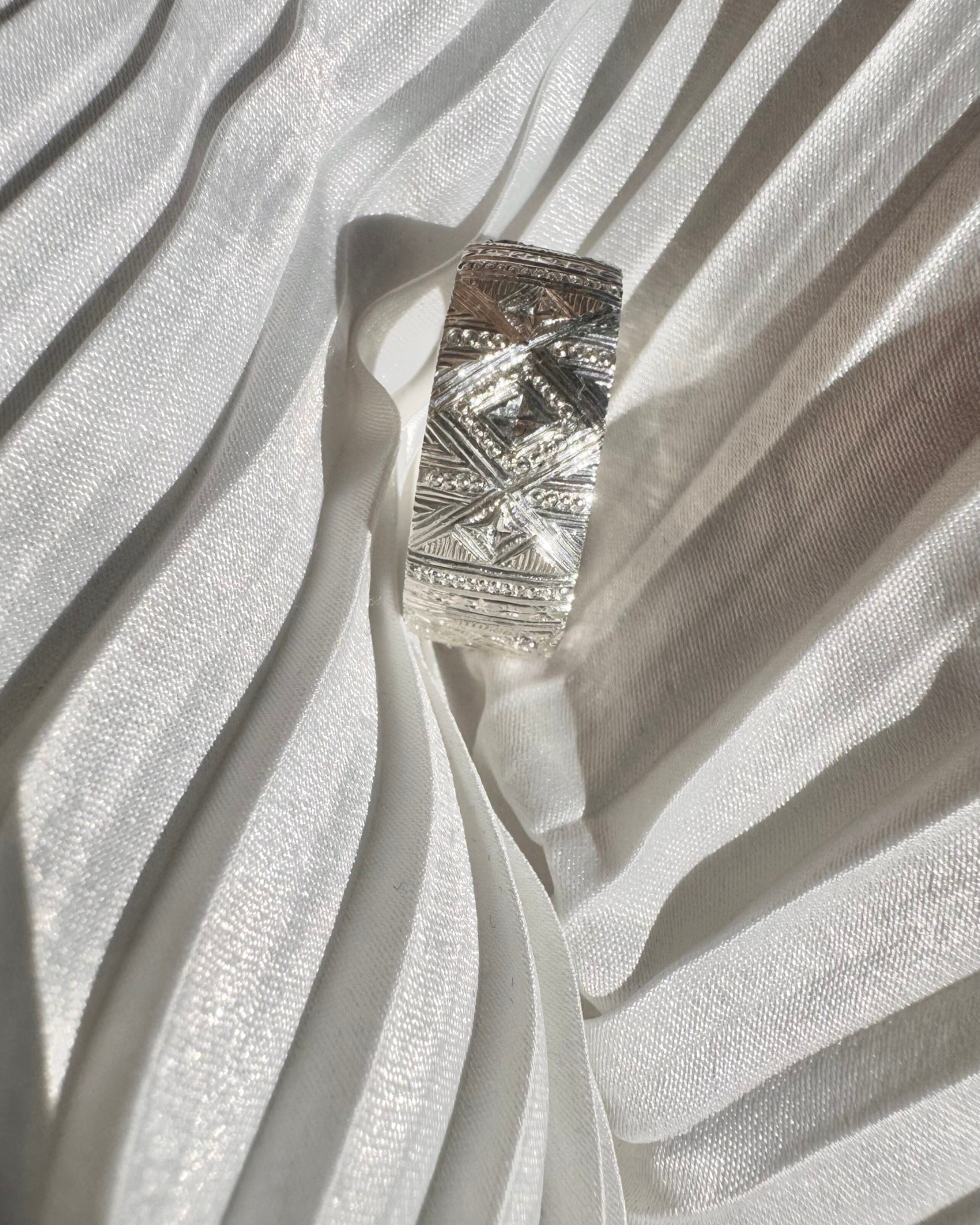 たっぷりの純銀を使い正面真ん中はガーネット・パライバトルマリンを使いマルチカラーサファイアを散りばめ、全23粒埋め込み隙間なく煌めくように彫りを施しました。